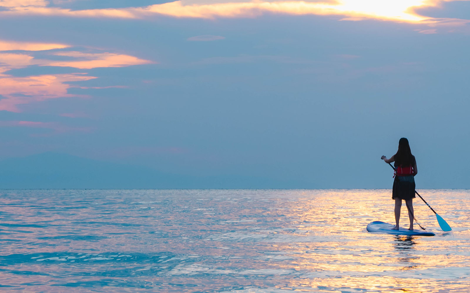 ボードの上に立ち、パドルを使って水面を進む人気のウォーターアクティビティ「SUP(サップ)」。旅先でもSUPを楽しむというAYUMIさんが心待ちにしていたのが、沈みゆく夕陽を眺められる『イザナギSUP』の体験。透明度が高く、遠浅な「江井海水浴場」は、「とても漕ぎやすくて、気持ちがいいです!」と楽しそうな様子。インストラクターと一緒に沖に向かって漕いでいると、次第に空と海が茜色に。刻々と表情が変わる幻想的な光景は、旅の記憶に残るワンシーンとなりました。