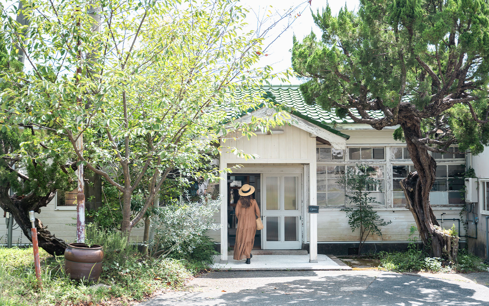 ホテルで朝の時間をゆったり過ごした後は、山の上に佇むカフェ『森ノオト』へ。緑に囲まれた白い一軒家の扉を開けると、アンティークの家具や古道具が配された居心地のよい空間が広がり、非日常へと誘われます。この日は、採れたての旬の野菜や淡路島米など、島の豊かな食材が主役のランチ「森のオト プレート」2200円を予約(15食限定)。彩り豊かで、滋味あふれる料理の数々にほっと心が和みます。