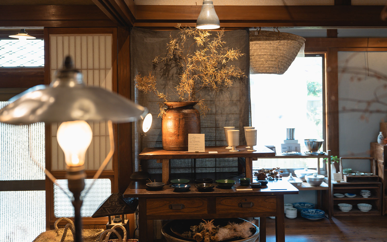 AYUMIさんが気になっていた雑貨店『のんきなリス』は、ランチで訪れた『森のオト』人気複合施設『こぞら荘』の姉妹店。趣のある古民家を改装した店内には、オーナーの審美眼でセレクトされた作家の器やアクセサリー、暮らしの道具などがセンスよく並びます。屋根裏部屋では、不定期開催で展示会も。小さな喫茶スペースもあり、自家焙煎豆で淹れる香り高いコーヒーやスイーツで憩うひと時も格別です。