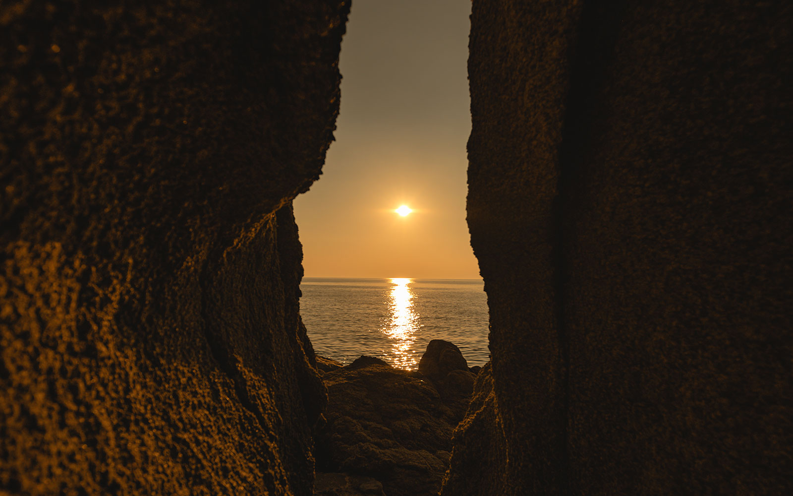 旅の締めくくりは、淡路島の美しい夕陽が眺められる絶景スポットへ。海に面した岩場に自然が作りあげた隙間があり、そこが産道に似ていることから「通ると生まれ変われる」といわれ、パワースポットとしても注目を集めています。ハイライトは日没30分前。刻々と茜色に染まる空と海のグラデーションはまさに息をのむ美しさ。神秘的な光景に心が洗われました。